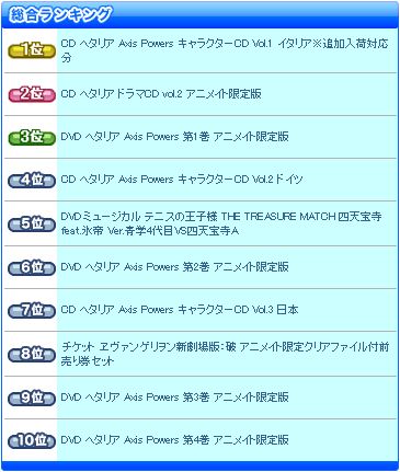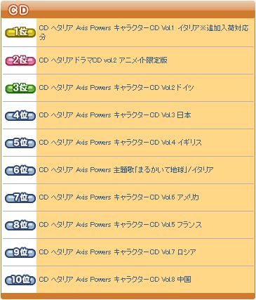 ヘタリア…なんという金の生る木\(^o^)/ そういえばDVDまだ予約してないんだけどどうしましょう(・ω・`) プーも出たことだしやはり買うべきなような気がしてきた。 ちなみにCDランキングの方がもっと酷いんだぜ! ※メイトのCD売上ランキングであり、ヘタリアCD売上ランキングではありません。 おおむねリリース順通りなのに米仏だけ逆転しているあたり キャラ人気の差を感じてちょっぴりせつなくなりますね